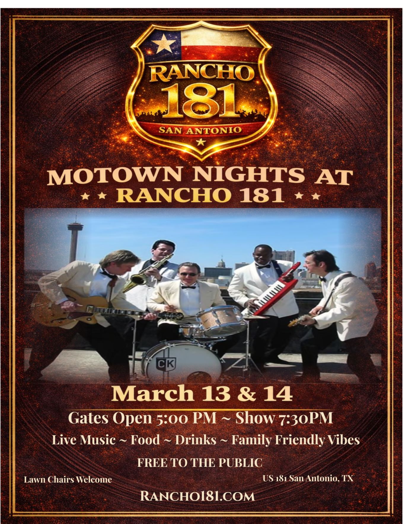 Join us under the Texas sky for an evening filled with classic Motown sounds, live performance, great food, and a welcoming atmosphere the whole family can enjoy. Bring your lawn chairs, gather your friends, and settle in for a night where the rhythm keeps the crowd moving and the good vibes never stop.