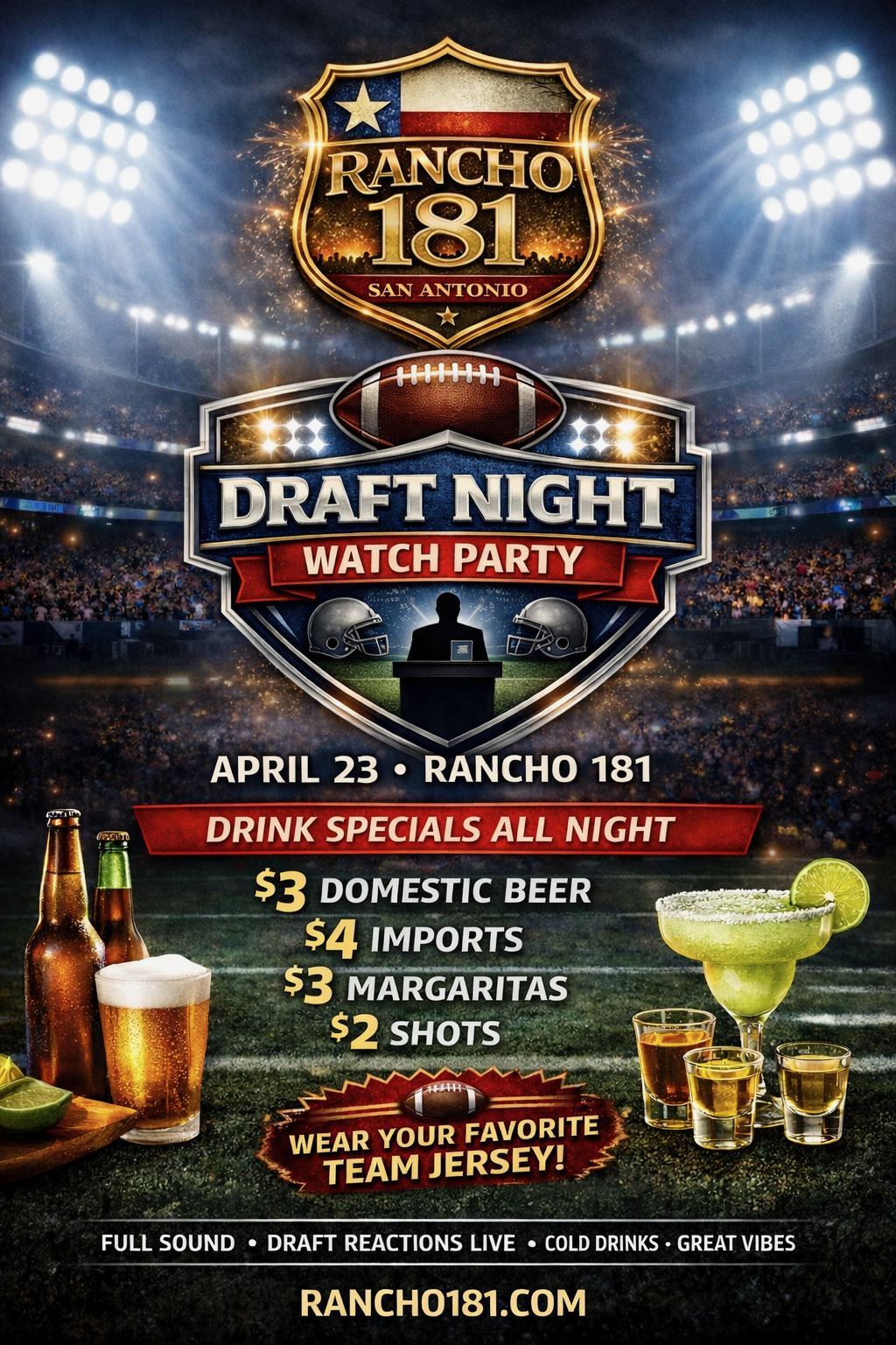 Football fans, get ready for an exciting Draft Night Watch Party at Rancho 181! Join us on April 23 for an unforgettable night of live draft reactions, music, drink specials, and game-day energy.