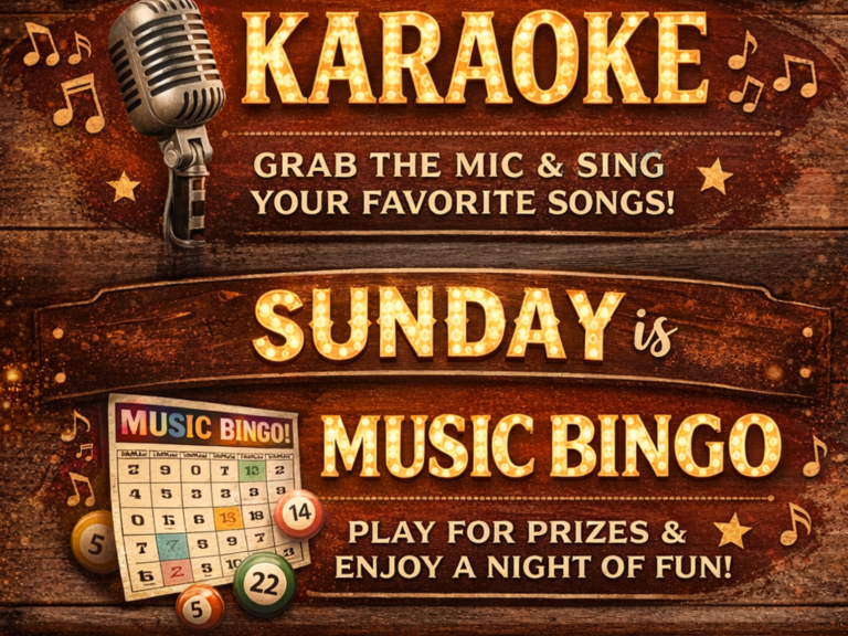 Then on Sundays, switch things up with Music Bingo, a fun and interactive twist on the classic game. Instead of numbers, you’ll match songs to your card while enjoying a mix of genres, great food, and drinks. It’s the perfect way to unwind, connect, and end the weekend on a high note.