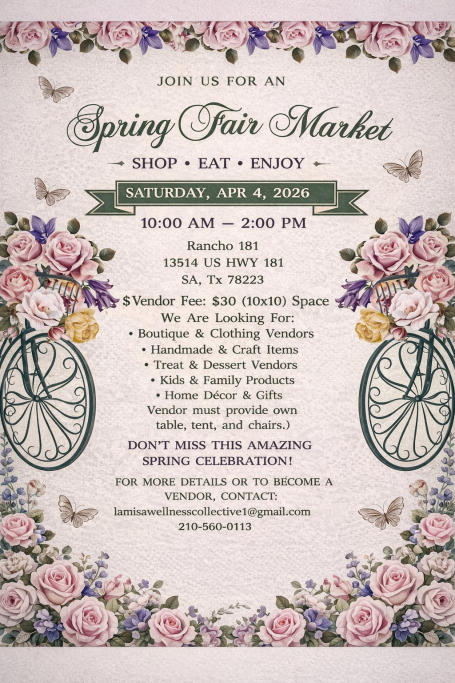 Join us for the Spring Fair Market on Saturday, April 4, 2026 from 10:00 AM to 2:00 PM at Rancho 181 in San Antonio. Spend the day shopping, eating, and enjoying a fun community market filled with local vendors and spring vibes.