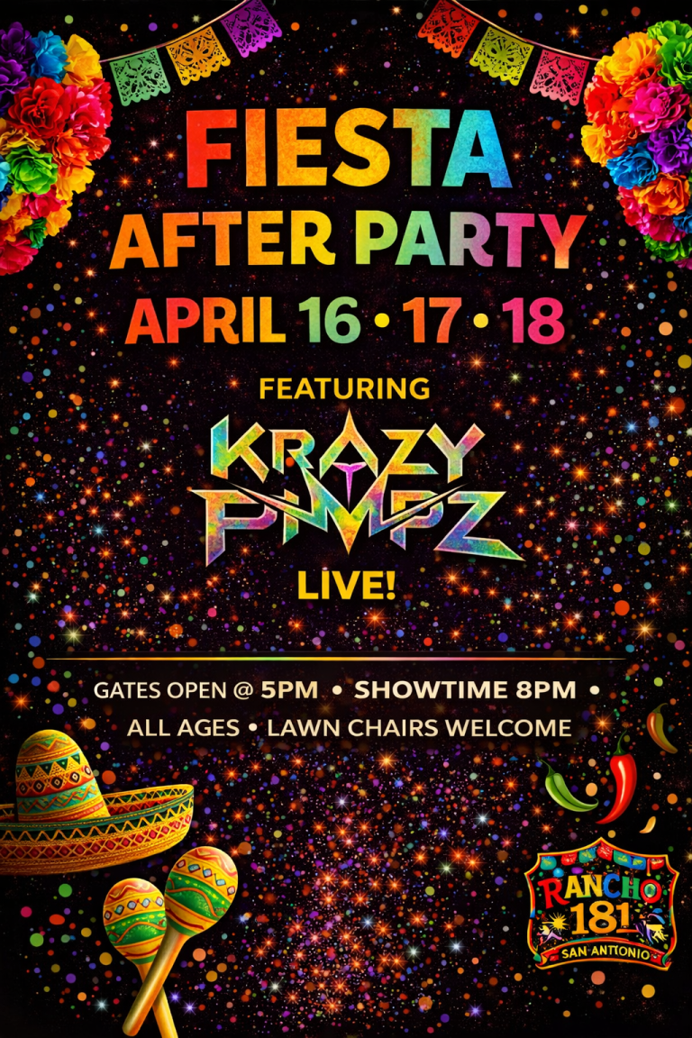 Join us at Rancho 181 for our Fiesta After Party, happening April 16th, 17th, and 18th, as we keep the San Antonio Fiesta spirit alive with live music, drink specials, great food, and unforgettable Rancho vibes.